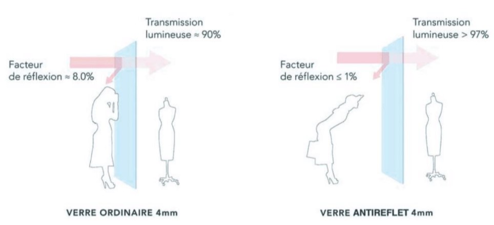 En effet, le vitrage antireflets STOP REFLECT est quasiment invisible. Il élimine presque totalement les reflets sur vos vitrages, environ 1% de réflexion lumineuse (contre 8% sur un verre classique), l’éblouissement provenant de l’environnement est également diminué, il donne une impression d’accessibilité aux objets qu’il protège.